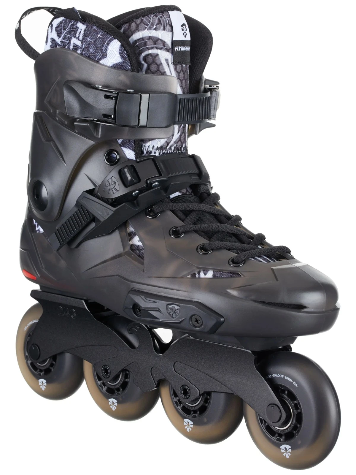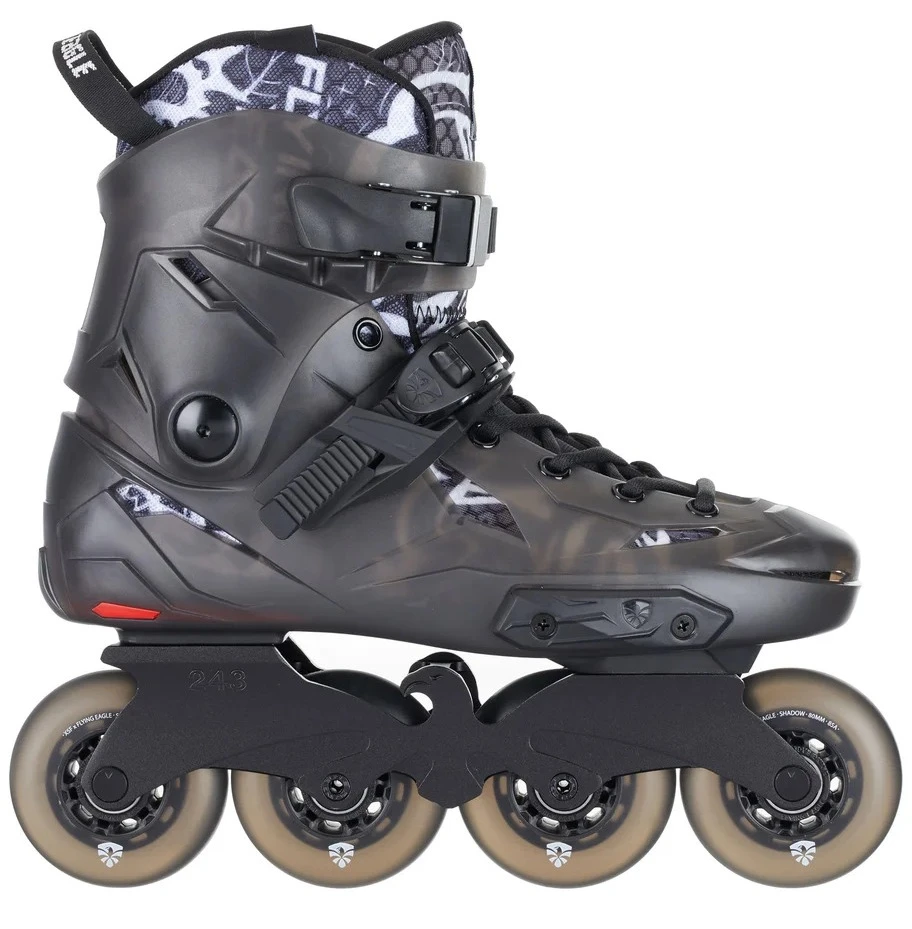 The Flying Eagle X5F Shadow Skates feature a sleek transparent black shell design. Equipped with flat 80mm wheels straight out of the box, the frames also allow for rockering the two outer wheels, providing the agility of pre-worn wheels if desired. These skates are ideal for urban freeskating and freestyle slalom, combining style and performance.