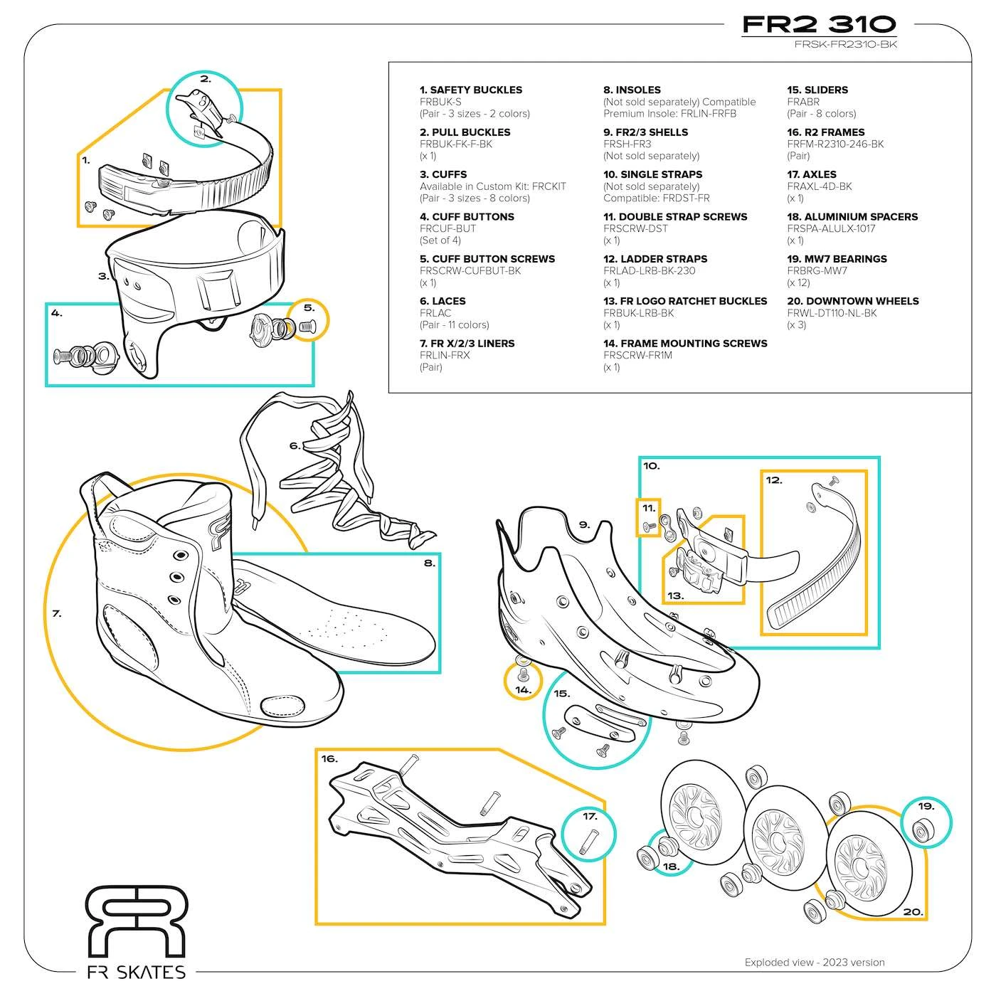 Starting from the top, the FR2 310 model boasts a cuff with the most advanced canting system in the industry. This system allows for 16 different cuff positions, helping to address pronation or supination issues or simply allowing users to adjust the cuff height. FR Skates was one of the first to introduce a replaceable abrasive pad on the side, known as a "slider," which protects the boots during wheel slides (shuffles). Naturally, this feature is present in the current FR2 edition as well.