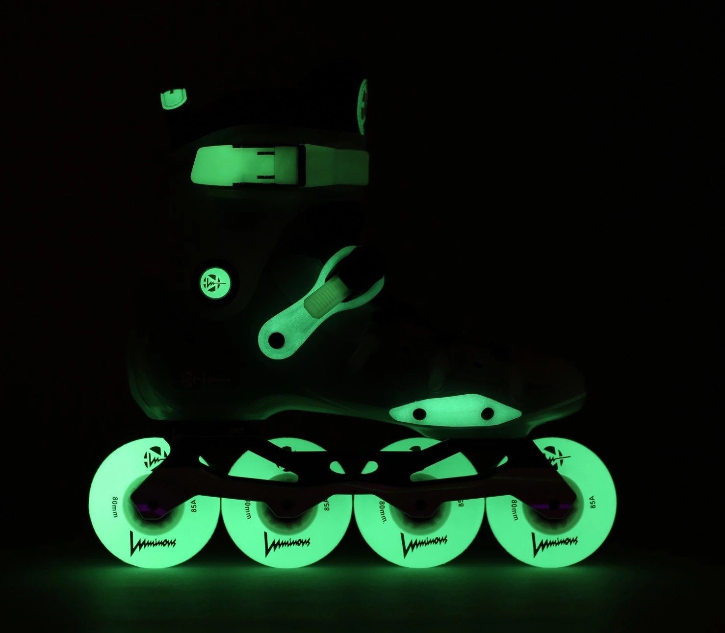 The Luminous Wheels come in White Glow, with a choice of 80mm/85A or 84mm/85A, depending on the mounted frame. These skates are built with A xBEC 9 bearings, renowned for their smooth rolling and durability.