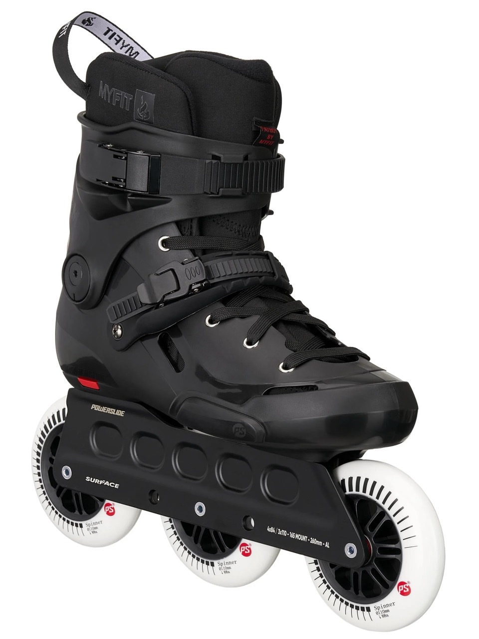 The Powerslide Storm 110 Skates in all black are built for speed and versatility. They come equipped with 3x110mm frames straight out of the box but also support 4x80mm wheels for a different skating experience. Introduced in 2024, the Storm boot features a new mold that shares the 2-point 165mm frame mount spacing with the Imperial boot but offers a wider fit overall.