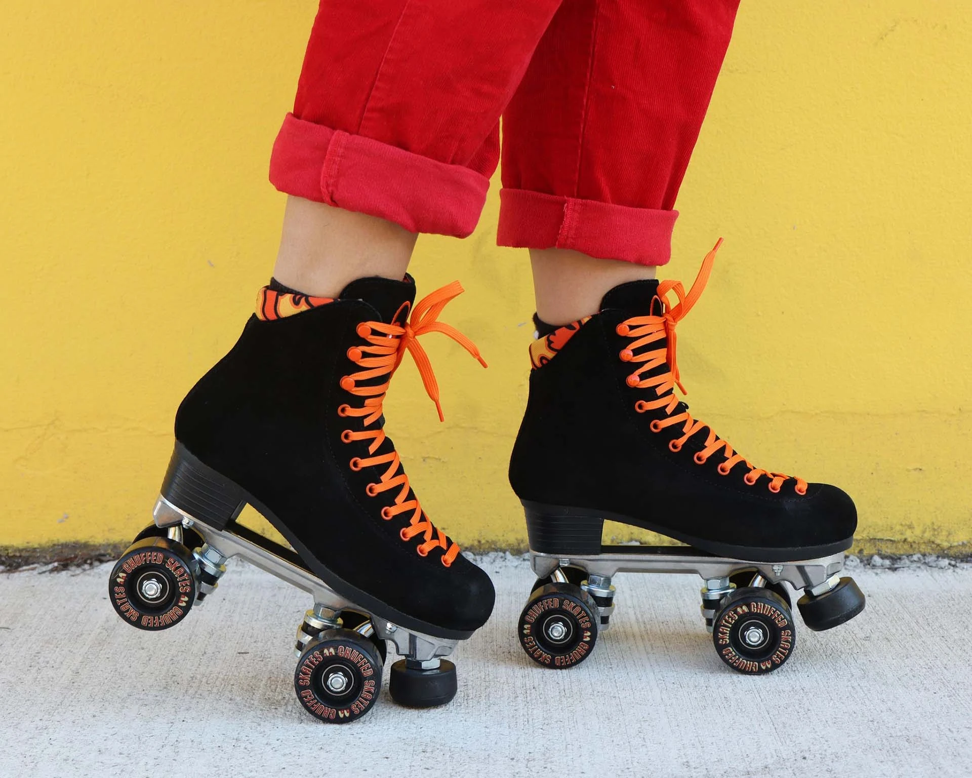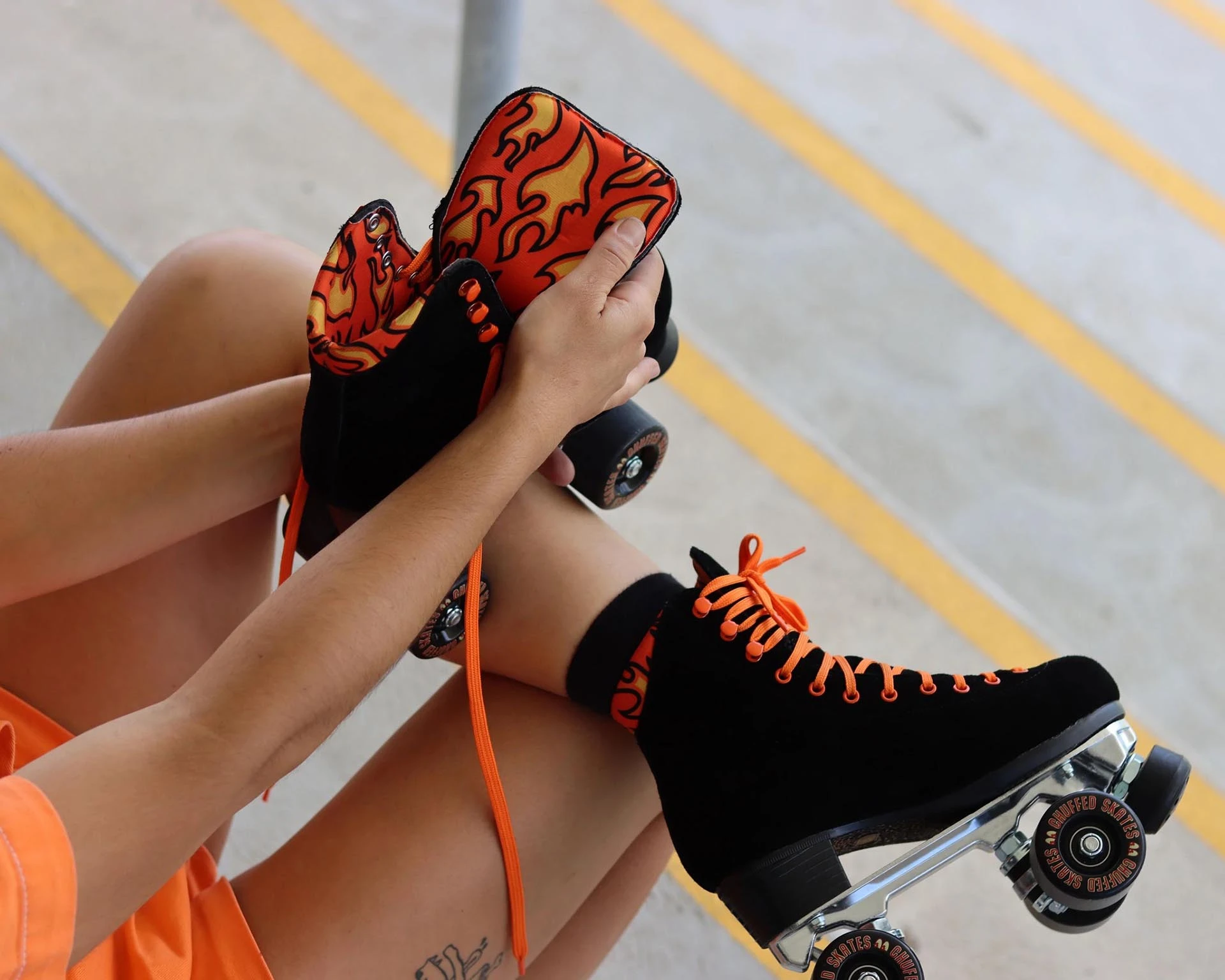 These roller skates are the first in our Chuffed Crew collection and are inspired by the fiery Sugu Valbuena Sanchez. They feature a piping hot flame lining designed by Sugu herself, and a black suede outer with orange eyelets and laces.